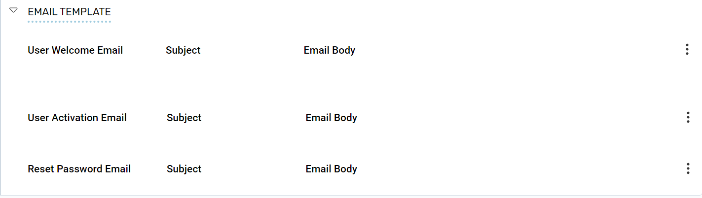 The email template allows to manage email templates such as User Welcome email, User Activation email, and Reset Password email.