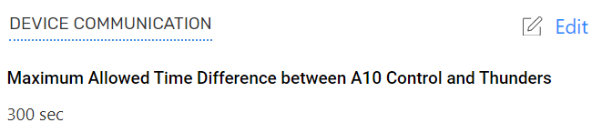 For real-time monitoring of analytics, the time between a Thunder device and the A10 Control must be synchronized. The Device Communication page allows to configure the maximum time difference between 90 - 900 seconds.