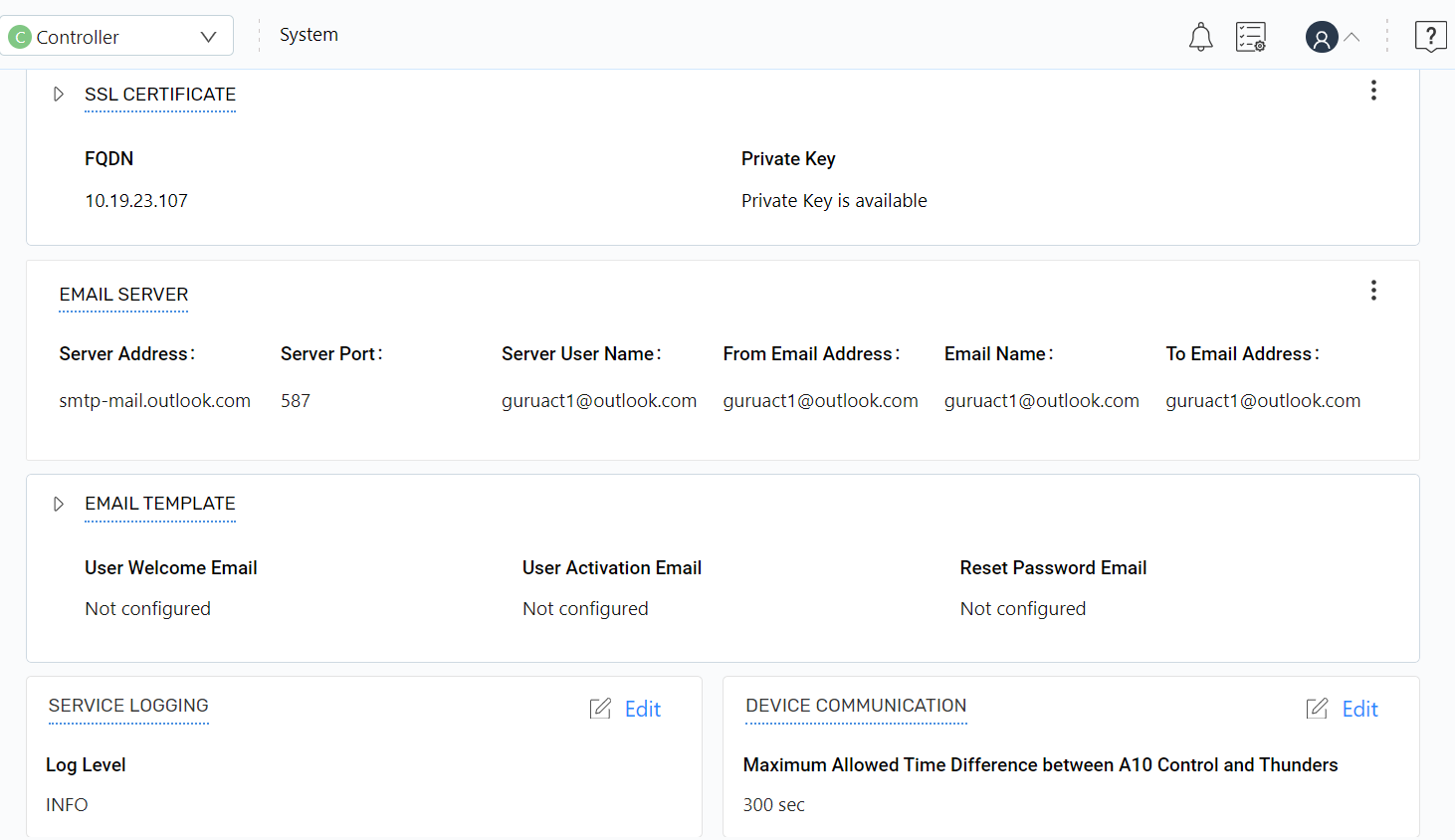 Navigate to System > Device Communication to configure the time between a Thunder device and the A10 Control.