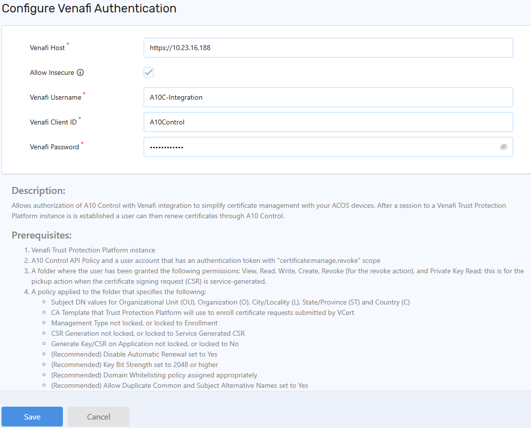 The Venafi integration is performed at the organization level. To manage certificates, administrators need to configure the Venafi host and provide the required credentials.