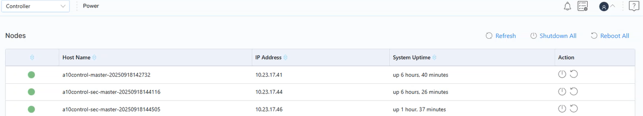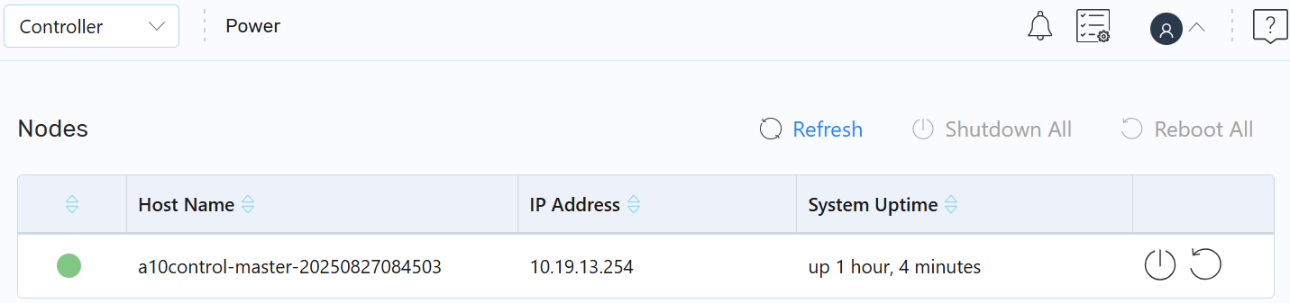 The Power menu allows a controller or super-admin to safely perform power operations, such as reboot or shut down nodes through the A10 Control GUI.