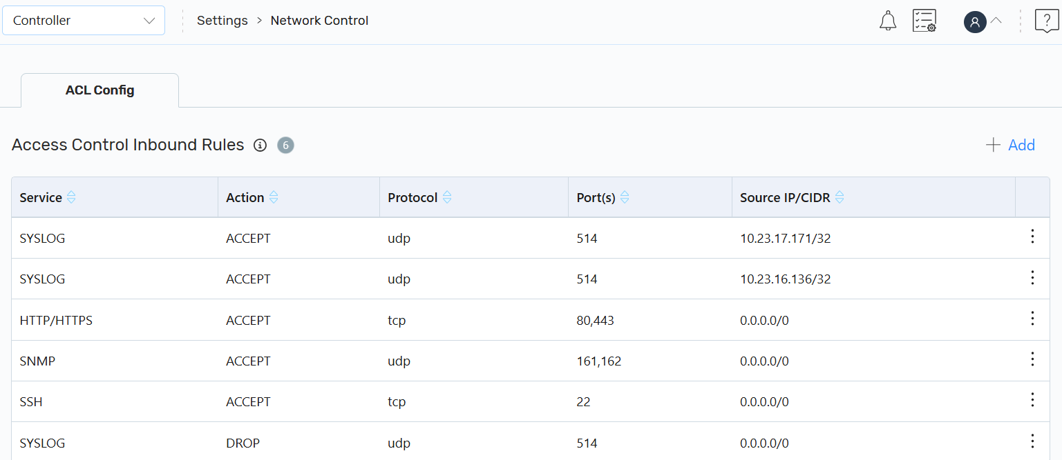 Navigate to Settings > Network Control > ACL Config to manage ACL inbound rules.