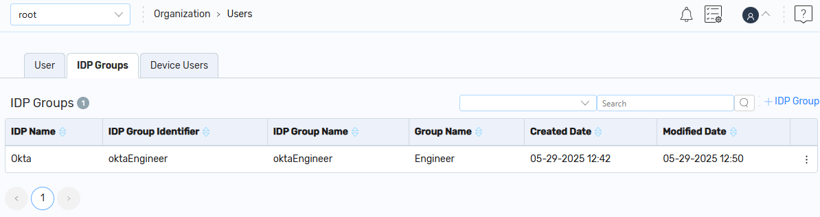 | NOTE: | The IDP Groups tab is displayed only when a supported IDP (Azure AD or Okta) is configured. |