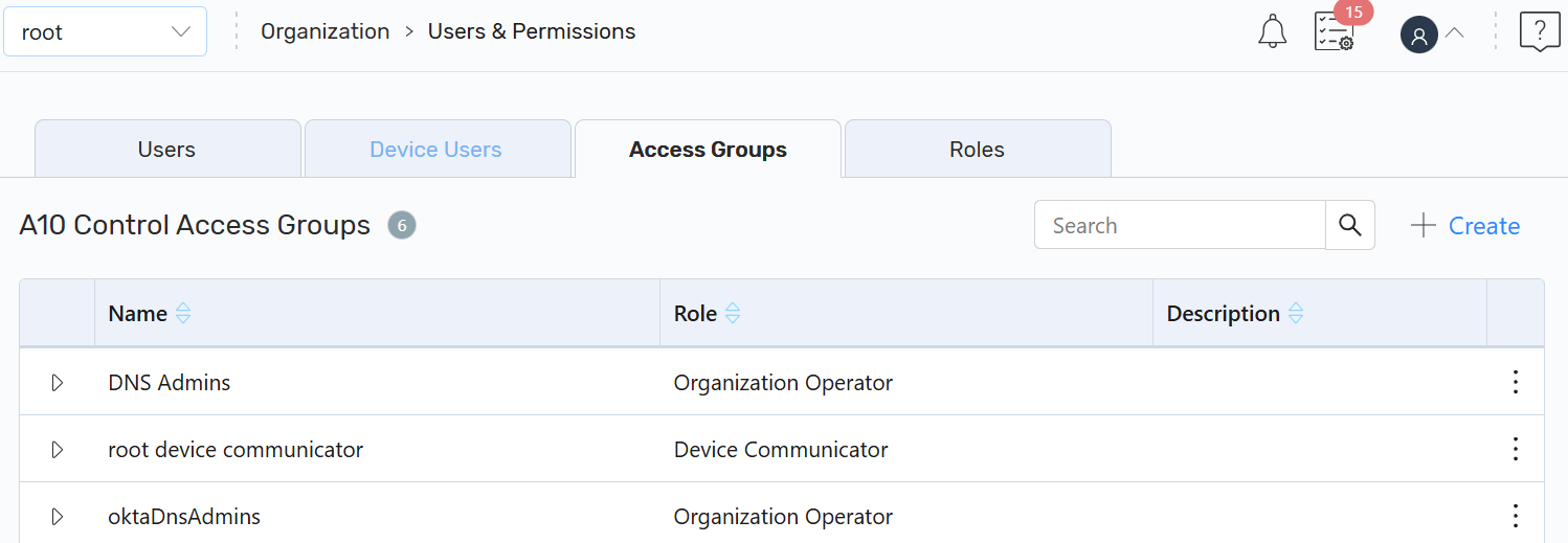 Navigate to Organization > Users & Permissions > Access Groups to view and manage access groups associated with your organization in A10 Control.