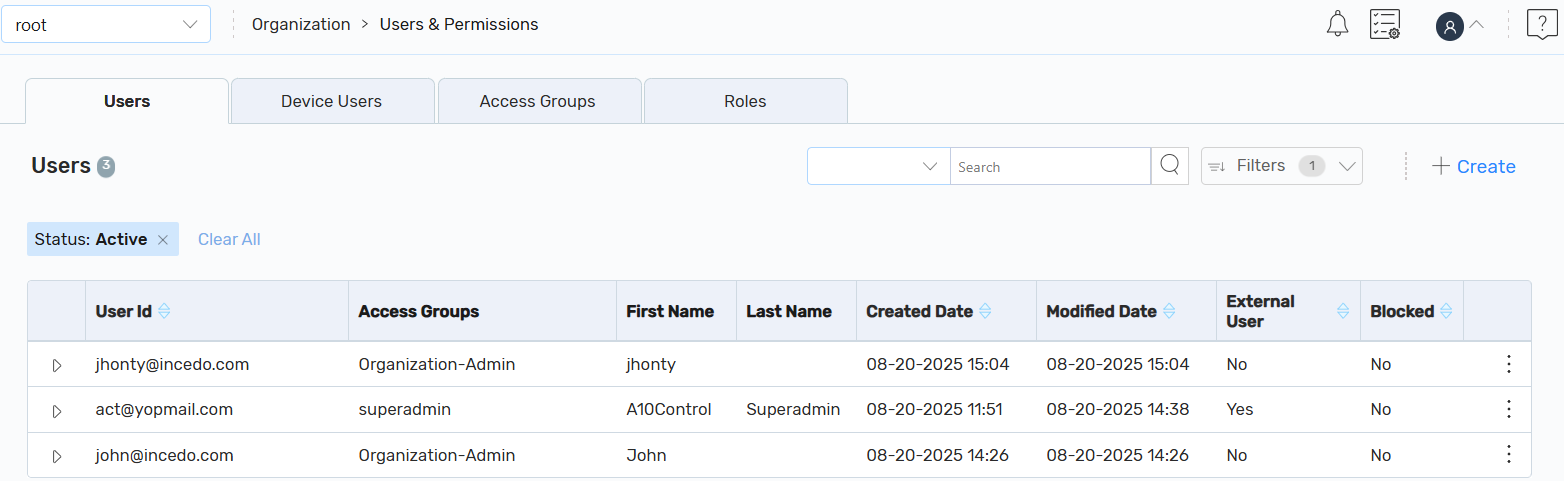 The Users module allows the organization administrator manage users from a single interface. Users are individual accounts that log in and interact with A10 Control. Each user’s permission is based on their assigned roles and access groups.